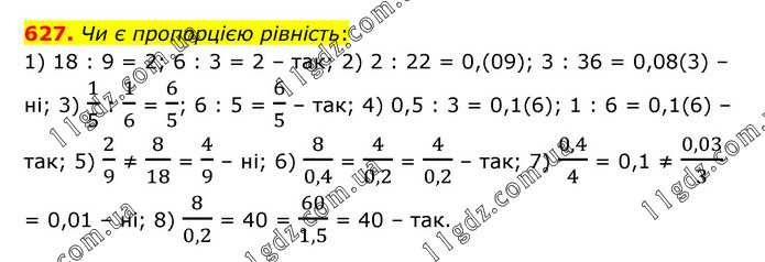 Чи є пропорцією рівність: 1) 18 : 9 = 2; 6 : 3 = 2 – так; 2) 2 : 22 = 0,(09); 3 : 36 = 0,08(3) – ні; 3) 1/5 : 1/6 = 6/5; 6 : 5 = 6/5 – так; 4) 0,5 : 3 = 0,1(6); 1 : 6 = 0,1(6) – так; 5) 2/9 ≠ 8/18 = 4/9 – ні; 6) 8/0,4 = 4/0,2 = 4/0,2 – так; 7) 0,4/4 = 0,1 ≠ 0,03/3 = 0,01 – ні; 8) 8/0,2 = 40 = 60/1,5 = 40 – так.