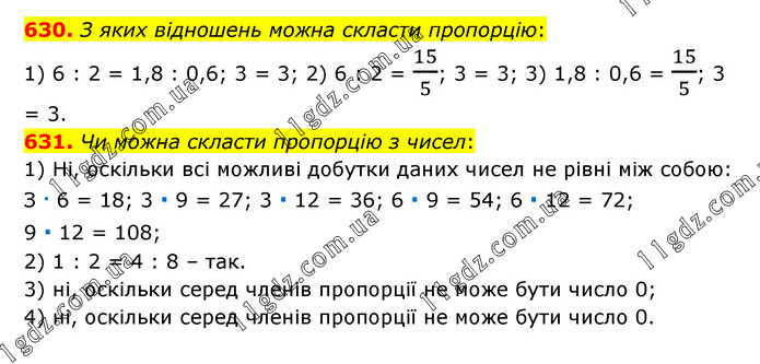 630. З яких відношень можна скласти пропорцію: 1) 6 : 2 = 1,8 : 0,6; 3 = 3; 2) 6 : 2 = 15/5; 3 = 3; 3) 1,8 : 0,6 = 15/5; 3 = 3. 631. Чи можна скласти пропорцію з чисел: 1) Ні, оскільки всі можливі добутки даних чисел не рівні між собою: З ∙ 6 = 18; 3 ∙ 9 = 27; 3 ∙ 12 = 36; 6 ∙ 9 = 54; 6 ∙ 12 = 72; 9 ∙ 12 = 108; 2) 1 : 2 = 4 : 8 – так. 3) ні, оскільки серед членів пропорції не може бути число 0; 4) ні, оскільки серед членів пропорції не може бути число 0.
