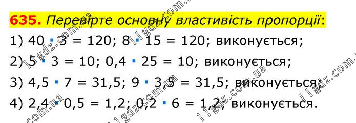 Перевірте основну властивість пропорції: 1) 40 ∙ 3 = 120; 8 ∙ 15 = 120; виконується; 2) 5 ∙ 3 = 10; 0,4 ∙ 25 = 10; виконується; 3) 4,5 ∙ 7 = 31,5; 9 ∙ 3,5 = 31,5; виконується; 4) 2,4 ∙ 0,5 = 1,2; 0,2 ∙ 6 = 1,2; виконується.