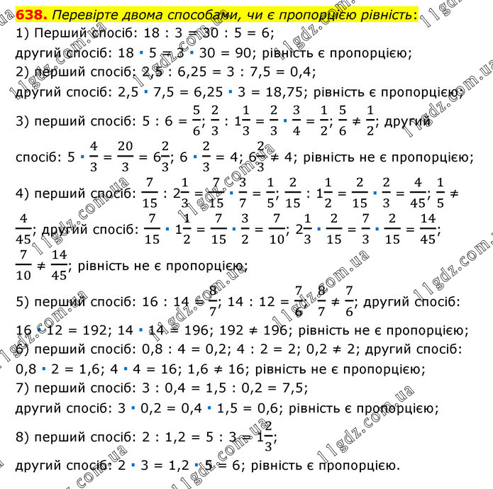 Перевірте двома способами, чи є пропорцією рівність: 1) Перший спосіб: 18 : 3 = 30 : 5 = 6; другий спосіб: 18 ∙ 5 = 3 ∙ 30 = 90; рівність є пропорцією; 2) перший спосіб: 2,5 : 6,25 = 3 : 7,5 = 0,4; другий спосіб: 2,5 ∙ 7,5 = 6,25 ∙ 3 = 18,75; рівність є пропорцією; 3) перший спосіб: 5 : 6 = 5/6; 2/3 : 11/3 = 2/3 ∙ 3/4 = 1/2; 5/6 ≠ 1/2; другий спосіб: 5 ∙ 4/3 = 20/3 = 62/3; 6 ∙ 2/3 = 4; 62/3 ≠ 4; рівність не є пропорцією; 4) перший спосіб: 7/15 : 21/3 = 7/15 ∙ 3/7 = 1/5; 2/15 : 11/2 = 2/15 ∙ 2/3 = 4/45; 1/5 ≠ 4/45; другий спосіб: 7/15 ∙ 11/2 = 7/15 ∙ 3/2 = 7/10; 21/3 ∙ 2/15 = 7/3 ∙ 2/15 = 14/45; 7/10 ≠ 14/45; рівність не є пропорцією; 5) перший спосіб: 16 : 14 = 8/7; 14 : 12 = 7/6; 8/7 ≠ 7/6; другий спосіб: 16 ∙ 12 = 192; 14 ∙ 14 = 196; 192 ≠ 196; рівність не є пропорцією; 6) перший спосіб: 0,8 : 4 = 0,2; 4 : 2 = 2; 0,2 ≠ 2; другий спосіб: 0,8 ∙ 2 = 1,6; 4 ∙ 4 = 16; 1,6 ≠ 16; рівність не є пропорцією; 7) перший спосіб: 3 : 0,4 = 1,5 : 0,2 = 7,5; другий спосіб: 3 ∙ 0,2 = 0,4 ∙ 1,5 = 0,6; рівність є пропорцією; 8) перший спосіб: 2 : 1,2 = 5 : 3 = 12/3; другий спосіб: 2 ∙ 3 = 1,2 ∙ 5 = 6; рівність є пропорцією.