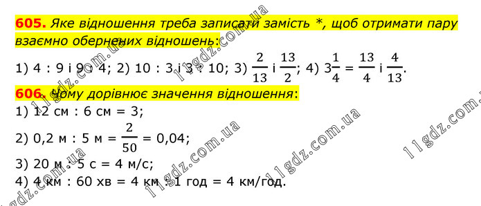 605. Яке відношення треба записати замість *, щоб отримати пару взаємно обернених відношень: 1) 4 : 9 і 9 : 4; 2) 10 : 3 і 3 : 10; 3) 2/13 і 13/2; 4) 31/4 = 13/4 і 4/13. 606. Чому дорівнює значення відношення: 1) 12 см : 6 см = 3; 2) 0,2 м : 5 м = 2/50 = 0,04; 3) 20 м : 5 с = 4 м/с; 4) 4 км : 60 хв = 4 км : 1 год = 4 км/год.