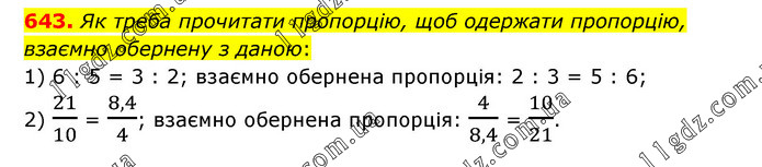 Як треба прочитати пропорцію, щоб одержати пропорцію, взаємно обернену з даною: 1) 6 : 5 = 3 : 2; взаємно обернена пропорція: 2 : 3 = 5 : 6; 2) 21/10 = 8,4/4; взаємно обернена пропорція: 4/8,4 = 10/21.