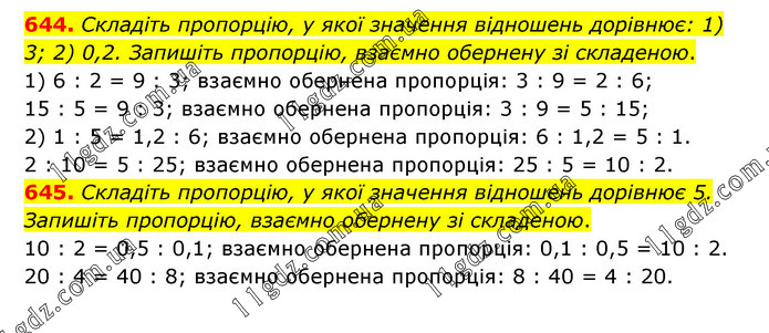 644. Складіть пропорцію, у якої значення відношень дорівнює: 1) 3; 2) 0,2. Запишіть пропорцію, взаємно обернену зі складеною. 1) 6 : 2 = 9 : 3; взаємно обернена пропорція: 3 : 9 = 2 : 6; 15 : 5 = 9 : 3; взаємно обернена пропорція: 3 : 9 = 5 : 15; 2) 1 : 5 = 1,2 : 6; взаємно обернена пропорція: 6 : 1,2 = 5 : 1. 2 : 10 = 5 : 25; взаємно обернена пропорція: 25 : 5 = 10 : 2. 645. Складіть пропорцію, у якої значення відношень дорівнює 5. Запишіть пропорцію, взаємно обернену зі складеною. 10 : 2 = 0,5 : 0,1; взаємно обернена пропорція: 0,1 : 0,5 = 10 : 2. 20 : 4 = 40 : 8; взаємно обернена пропорція: 8 : 40 = 4 : 20.