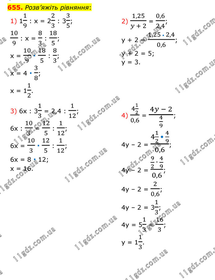 Розв’яжіть рівняння: 1) 11/9 : x = 22/3 : 33/5; 10/9 : x = 8/3 : 18/5; x = 10/9 ∙ 18/5 : 8/3; x = 4 ∙ 3/8; x = 11/2. 2) 1,25/(y + 2) = 0,6/2,4; y + 2 = (1,25 • 2,4)/0,6; y + 2 = 5; y = 3. 3) 6x : 31/3 = 2,4 : 1/12; 6x : 10/3 = 12/5 : 1/12; 6x = 10/3 ∙ 12/5 : 1/12; 6x = 8 ∙ 12; x = 16. 4) (4 1/2)/0,6 = (4y - 2)/(4/9); 4y – 2 = (4 1/2 • 4/9)/0,6; 4y – 2 = (9/2 ∙ 4/9)/0,6; 4y – 2 = 2/0,6; 4y – 2 = 31/3; 4y = 51/3 = 16/3; y = 11/3.
