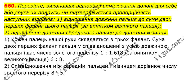 Перевірте, виконавши відповідні вимірювання долоні для себе або друга чи подруги, чи підтверджується пропорційність наступних відрізків: 1) відношення довжини пальця до суми двох перших фаланг цього пальця (за винятком великого пальця); 2) відношення довжини середнього пальця до довжини мізинця. 1) Кожен палець нашої руки складається з трьох фаланг. Сума двох перших фаланг пальця у співвідношенні з усією довжиною пальця і дає число золотого перелізу 1 : 1,618 (за винятком великого пальця) 6 : 8. 2) Співвідношення між середнім пальцем і мізинцем дорівнює числу золотого перерізу 8 : 5.