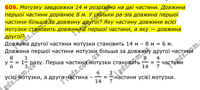 Мотузку завдовжки 14 м розрізано на дві частини. Довжина першої частини дорівнює 8 м. У скільки разів довжина першої частини більша за довжину другої? Яку частину довжини всієї мотузки становить довжина її першої частини, а яку — довжина другої? Довжина другої частини мотузки становить 14 м – 8 м = 6 м. Довжина першої частини мотузки більша за довжину другої частини у 8/6 = 11/3 разу. Перша частина мотузки становить 8/14 = 4/7 частини усієї мотузки, а друга частина – 6/14 = 3/7 частини усієї мотузки.