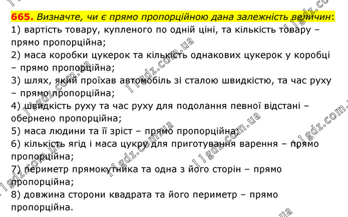 Визначте, чи є прямо пропорційною дана залежність величин: 1) вартість товару, купленого по одній ціні, та кількість товару – прямо пропорційна; 2) маса коробки цукерок та кількість однакових цукерок у коробці – прямо пропорційна; 3) шлях, який проїхав автомобіль зі сталою швидкістю, та час руху – прямо пропорційна; 4) швидкість руху та час руху для подолання певної відстані – обернено пропорційна; 5) маса людини та її зріст – прямо пропорційна; 6) кількість ягід і маса цукру для приготування варення – прямо пропорційна; 7) периметр прямокутника та одна з його сторін – прямо пропорційна; 8) довжина сторони квадрата та його периметр – прямо пропорційна.
