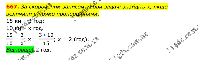 За скороченим записом умови задачі знайдіть х, якщо величини є прямо пропорційними. 15 км – 3 год; 10 км – х год. 15/10 = 3/х; х = (3 • 10)/15; х = 2 (год). Відповідь: 2 год.