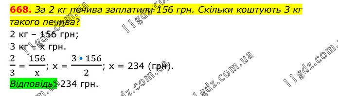 За 2 кг печива заплатили 156 грн. Скільки коштують З кг такого печива? 2 кг – 156 грн; 3 кг – х грн. 2/3 = 156/х; х = (3 • 156)/2; х = 234 (грн). Відповідь: 234 грн.