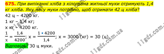 При випіканні хліба з кілограма житньої муки отримують 1,4 кг хліба. Яку масу муки потрібно, щоб отримати 42 ц хліба? 42 ц – 4200 кг. 1 кг – 1,4 кг; х кг – 4200 кг. 1/х = 1,4/4200; х = (1 • 4200)/1,4; х = 3000 (кг) = 30 (ц). Відповідь: 30 ц муки.