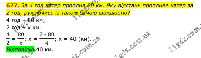 За 4 год катер проплив 80 км. Яку відстань пропливе катер за 2 год, рухаючись із такою самою швидкістю? 4 год – 80 км; 2 год – х км. 4/2 = 80/х; х = (2 • 80)/4; х = 40 (км). Відповідь: 40 км.