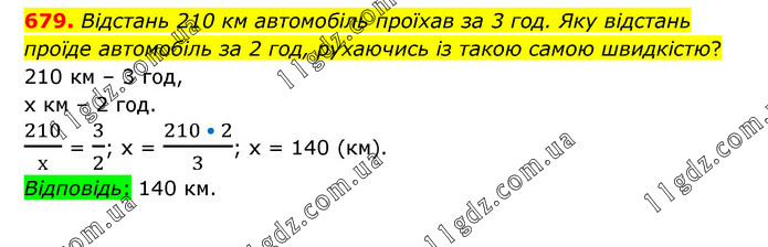 Відстань 210 км автомобіль проїхав за 3 год. Яку відстань проїде автомобіль за 2 год, рухаючись із такою самою швидкістю? 210 км – 3 год, х км – 2 год. 210/х = 3/2; х = (210 • 2)/3; х = 140 (км). Відповідь: 140 км.