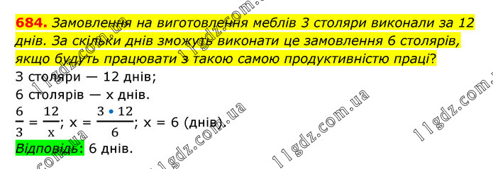Замовлення на виготовлення меблів 3 столяри виконали за 12 днів. За скільки днів зможуть виконати це замовлення 6 столярів, якщо будуть працювати з такою самою продуктивністю праці? З столяри — 12 днів; 6 столярів — x днів. 6/3 = 12/х; х = (3 • 12)/6; х = 6 (днів). Відповідь: 6 днів.
