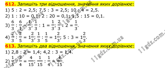 612. Запишіть три відношення, значення яких дорівнює: 1) 5 : 2 = 2,5; 7,5 : 3 = 2,5; 10 : 4 = 2,5. 2) 1 : 10 = 0,1; 2 : 20 = 0,1; 1,5 : 15 = 0,1. 3) 6/3 : 6/1 = 1/3; 1/3 : 1 = 1/3; 2/3 : 2 = 1/3. 4) 2/3 : 2/5 = 12/3; 1/3 : 1/5 = 12/3; 5 : 3 = 12/3. 613. Запишіть два відношення, значення яких дорівнює: 1) 2,8 : 2 = 1,4; 4,2 : 3 = 1,4. 2) 1/5 : 3/4 = 4/15; 1/15 : 1/4 = 4/15.