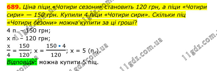 Ціна піци «Чотири сезони» становить 120 грн, а піци «Чотири сири» — 150 грн. Купили 4 піци «Чотири сири». Скільки піц «Чотири сезони» можна купити за ці гроші? 4 п. – 150 грн; х п. – 120 грн; х/4 = 150/120; х = (150 • 4)/120; х = 5 (п.). Відповідь: можна купити 5 піц.