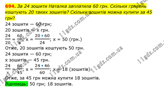 За 24 зошити Наталка заплатила 60 грн. Скільки гривень коштують 20 таких зошитів? Скільки зошитів можна купити за 45 грн? 24 зошити — 60 грн; 20 зошитів — x грн. 24/20 = 60/х; х = (20 • 60)/24; х = 50 (грн.) Отже, 20 зошитів коштують 50 грн. 24 зошити — 60 грн; х зошитів — 45 грн. 24/х = 60/45; х = (24 • 46)/60; х = 18 (зошитів). Отже, за 45 грн можна купити 18 зошитів. Відповідь: 50 грн; 18 зошитів.