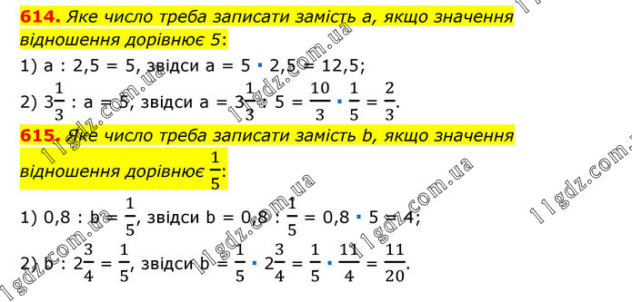 614. Яке число треба записати замість а, якщо значення відношення дорівнює 5: 1) а : 2,5 = 5, звідси а = 5 ∙ 2,5 = 12,5; 2) 31/3 : а = 5, звідси а = 31/3 : 5 = 10/3 ∙ 1/5 = 2/3. 615. Яке число треба записати замість b, якщо значення відношення дорівнює 1/5: 1) 0,8 : b = 1/5, звідси b = 0,8 : 1/5 = 0,8 ∙ 5 = 4; 2) b : 23/4 = 1/5, звідси b = 1/5 ∙ 23/4 = 1/5 ∙ 11/4 = 11/20.