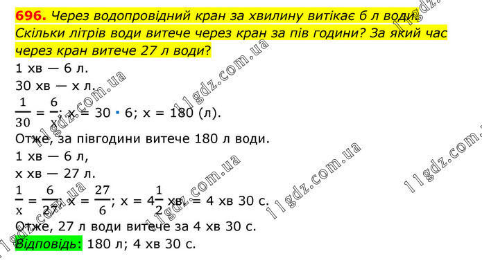 Через водопровідний кран за хвилину витікає б л води. Скільки літрів води витече через кран за пів години? За який час через кран витече 27 л води? 1 хв — 6 л. 30 хв — х л. 1/30 = 6/х; х = 30 ∙ 6; х = 180 (л). Отже, за півгодини витече 180 л води. 1 хв — 6 л, х хв — 27 л. 1/х = 6/27; х = 27/6; х = 41/2 хв. = 4 хв 30 с. Отже, 27 л води витече за 4 хв 30 с. Відповідь: 180 л; 4 хв 30 с.