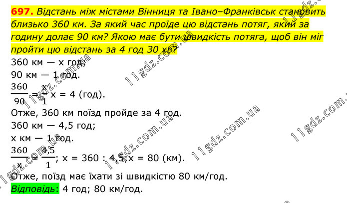 Відстань між містами Вінниця та Івано–Франківськ становить близько 360 км. За який час проїде цю відстань потяг, який за годину долає 90 км? Якою має бути швидкість потяга, щоб він міг пройти цю відстань за 4 год 30 хв? 360 км — х год; 90 км — 1 год. 360/90 = х/1 х = 4 (год). Отже, 360 км поїзд пройде за 4 год. 360 км — 4,5 год; х км — 1 год. 360/х = 4,5/1; х = 360 : 4,5;x = 80 (км). Отже, поїзд має їхати зі швидкістю 80 км/год. Відповідь: 4 год; 80 км/год.
