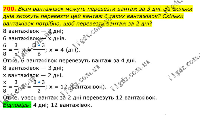 Вісім вантажівок можуть перевезти вантаж за 3 дні. За скільки днів зможуть перевезти цей вантаж 6 таких вантажівок? Скільки вантажівок потрібно, щоб перевезти вантаж за 2 дні? 8 вантажівок — 3 дні; 6 вантажівок — х днів. 6/8 = 3/х; х = (8 • 3)/6; х = 4 (дні). Отже, 6 вантажівок перевезуть вантаж за 4 дні. 8 вантажівок — 3 дні; х вантажівок — 2 дні. х/8 = 3/2; х = (8 • 3)/2; х = 12 (вантажівок). Отже, увесь вантаж за 2 дні перевезуть 12 вантажівок. Відповідь: 4 дні; 12 вантажівок.