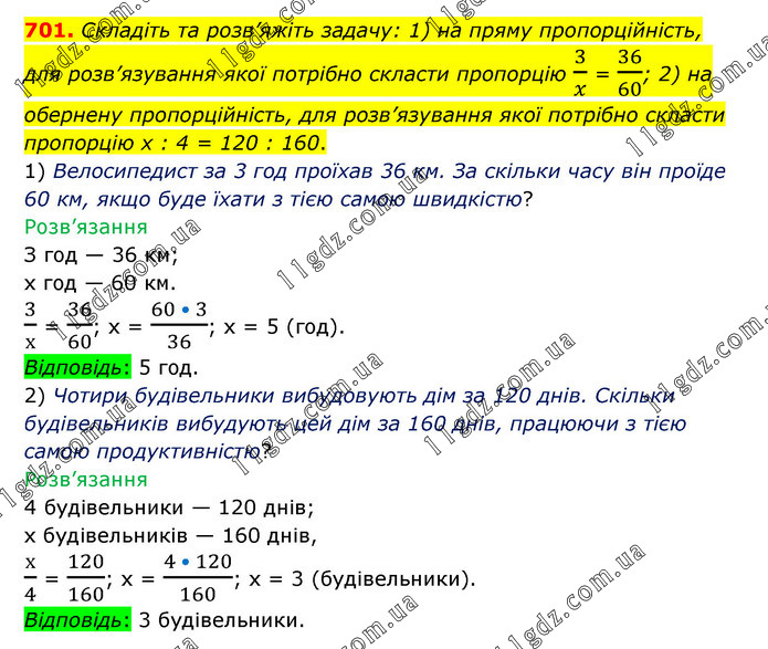 Складіть та розв’яжіть задачу: 1) на пряму пропорційність, для розв’язування якої потрібно скласти пропорцію 3/x = 36/60; 2) на обернену пропорційність, для розв’язування якої потрібно скласти пропорцію х : 4 = 120 : 160. 1) Велосипедист за 3 год проїхав 36 км. За скільки часу він проїде 60 км, якщо буде їхати з тією самою швидкістю? Розв’язання З год — 36 км; х год — 60 км. 3/х = 36/60; х = (60 • 3)/36; х = 5 (год). Відповідь: 5 год. 2) Чотири будівельники вибудовують дім за 120 днів. Скільки будівельників вибудують цей дім за 160 днів, працюючи з тією самою продуктивністю? Розв’язання 4 будівельники — 120 днів; х будівельників — 160 днів, х/4 = 120/160; х = (4 • 120)/160; х = 3 (будівельники). Відповідь: 3 будівельники.