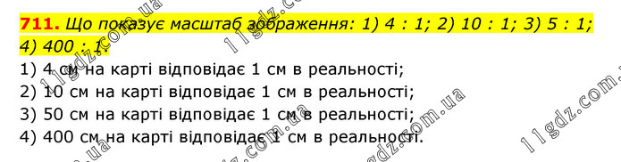 Що показує масштаб зображення: 1) 4 : 1; 2) 10 : 1; 3) 5 : 1; 4) 400 : 1. 1) 4 см на карті відповідає 1 см в реальності; 2) 10 см на карті відповідає 1 см в реальності; 3) 50 см на карті відповідає 1 см в реальності; 4) 400 см на карті відповідає 1 см в реальності