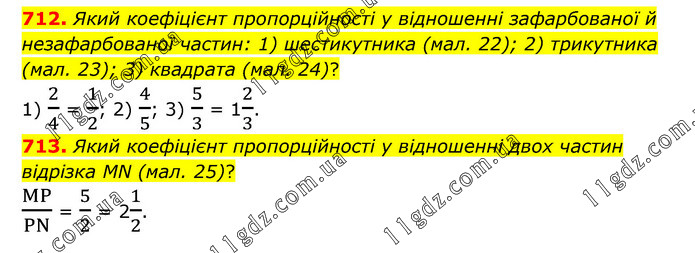 712. Який коефіцієнт пропорційності у відношенні зафарбованої й незафарбованої частин: 1) шестикутника (мал. 22); 2) трикутника (мал. 23); 3) квадрата (мал. 24)? 1) 2/4 = 1/2; 2) 4/5; 3) 5/3 = 12/3. 713. Який коефіцієнт пропорційності у відношенні двох частин відрізка MN (мал. 25)? MP/PN = 5/2 = 21/2.