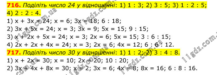 716. Поділіть число 24 у відношенні: 1) 1 : 3; 2) 3 : 5; 3) 1 : 2 : 5; 4) 2 : 2 : 4. 1) х + 3х = 24; х = 6; Зх = 18; 6 : 18; 2) Зх + 5х = 24; х = 3; Зх = 9; 5х = 15; 9 : 15; 3) х + 2х + 5х = 24; х = 3; 2х = 6; 5х = 15; 3 : 6 : 15; 4) 2х + 2х + 4х = 24; х = 3; 2х = 6; 4х = 12; 6 : 6 : 12. 717. Поділіть число 30 у відношенні: 1) 1 : 2; 2) 3 : 4 : 8. 1) х + 2х = 30; х = 10; 2х = 20; 10 : 20; 2) Зх + 4х + 8х = 30; х = 2; Зх = 6; 4х = 8; 8х = 16; 6 : 8 : 16.