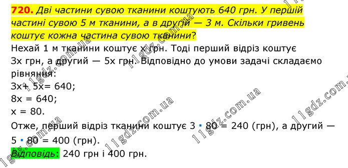 Дві частини сувою тканини коштують 640 грн. У першій частині сувою 5 м тканини, а в другій — 3 м. Скільки гривень коштує кожна частина сувою тканини? Нехай 1 м тканини коштує х грн. Тоді перший відріз коштує Зx грн, а другий — 5х грн. Відповідно до умови задачі складаємо рівняння: Зх+ 5х= 640; 8x = 640; х = 80. Отже, перший відріз тканини коштує 3 ∙ 80 = 240 (грн), а другий — 5 ∙ 80 = 400 (грн). Відповідь: 240 грн і 400 грн.