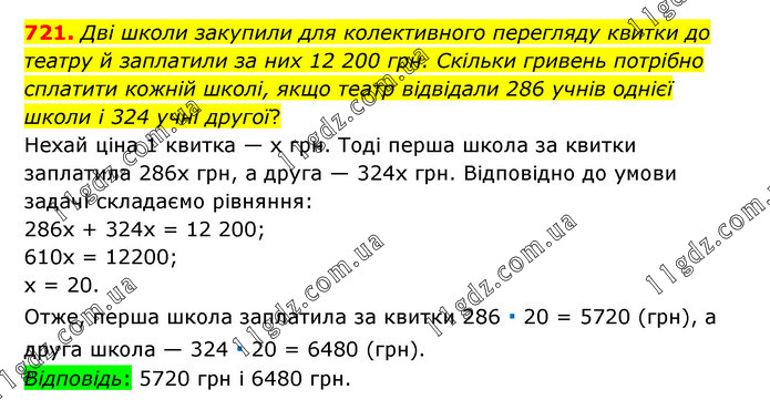 Дві школи закупили для колективного перегляду квитки до театру й заплатили за них 12 200 грн. Скільки гривень потрібно сплатити кожній школі, якщо театр відвідали 286 учнів однієї школи і 324 учні другої? Нехай ціна 1 квитка — х грн. Тоді перша школа за квитки заплатила 286x грн, а друга — 324x грн. Відповідно до умови задачі складаємо рівняння: 286x + 324x = 12 200; 610x = 12200; х = 20. Отже, перша школа заплатила за квитки 286 ∙ 20 = 5720 (грн), а друга школа — 324 ∙ 20 = 6480 (грн). Відповідь: 5720 грн і 6480 грн.