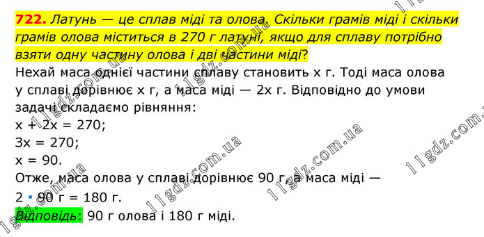 Латунь — це сплав міді та олова. Скільки грамів міді і скільки грамів олова міститься в 270 г латуні, якщо для сплаву потрібно взяти одну частину олова і дві частини міді? Нехай маса однієї частини сплаву становить x г. Тоді маса олова у сплаві дорівнює х г, а маса міді — 2x г. Відповідно до умови задачі складаємо рівняння: x + 2x = 270; Зx = 270; х = 90. Отже, маса олова у сплаві дорівнює 90 г, а маса міді — 2 ∙ 90 г = 180 г. Відповідь: 90 г олова і 180 г міді.