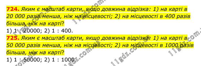 724. Яким є масштаб карти, якщо довжина відрізка: 1) на карті в 20 000 разів менша, ніж на місцевості; 2) на місцевості в 400 разів більша, ніж на карті? 1) 1 : 20000; 2) 1 : 400. 725. Яким є масштаб карти, якщо довжина відрізка: 1) на карті в 50 000 разів менша, ніж на місцевості; 2) на місцевості в 1000 разів більша, ніж на карті? 1) 1 : 50000; 2) 1 : 1000.