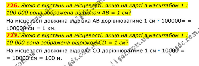 726. Якою є відстань на місцевості, якщо на карті з масштабом 1 : 100 000 вона зображена відрізком AB = 1 см? На місцевості довжина відрізка АВ дорівнюватиме 1 см ∙ 100000= = 100000 см = 1 км. 727. Якою є відстань на місцевості, якщо на карті з масштабом 1 : 10 000 вона зображена відрізком CD = 1 см? На місцевості довжина відрізка СО дорівнюватиме 1 см ∙ 10000 = = 10000 см = 100 м.