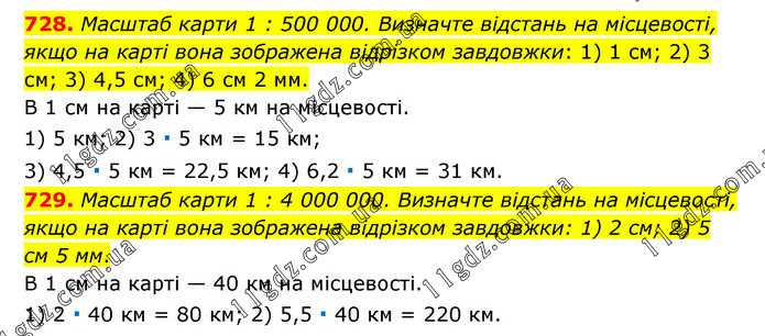 728. Масштаб карти 1 : 500 000. Визначте відстань на місцевості, якщо на карті вона зображена відрізком завдовжки: 1) 1 см; 2) 3 см; 3) 4,5 см; 4) 6 см 2 мм. В 1 см на карті — 5 км на місцевості. 1) 5 км; 2) 3 ∙ 5 км = 15 км; 3) 4,5 ∙ 5 км = 22,5 км; 4) 6,2 ∙ 5 км = 31 км. 729. Масштаб карти 1 : 4 000 000. Визначте відстань на місцевості, якщо на карті вона зображена відрізком завдовжки: 1) 2 см; 2) 5 см 5 мм. В 1 см на карті — 40 км на місцевості. 1) 2 ∙ 40 км = 80 км; 2) 5,5 ∙ 40 км = 220 км.