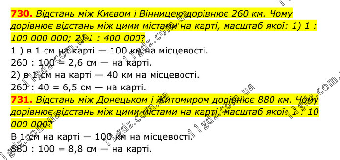 730. Відстань між Києвом і Вінницею дорівнює 260 км. Чому дорівнює відстань між цими містами на карті, масштаб якої: 1) 1 : 100 000 000; 2) 1 : 400 000? 1 ) в 1 см на карті — 100 км на місцевості. 260 : 100 = 2,6 см — на карті. 2) в 1 см на карті — 40 км на місцевості. 260 : 40 = 6,5 см — на карті. 731. Відстань між Донецьком і Житомиром дорівнює 880 км. Чому дорівнює відстань між цими містами на карті, масштаб якої: 1 : 10 000 000? В 1 см на карті — 100 км на місцевості. 880 : 100 = 8,8 см — на карті.