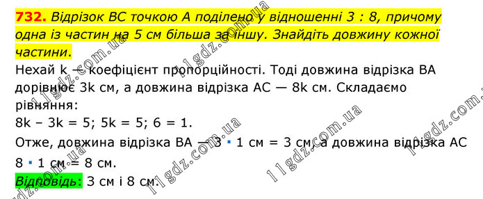 Відрізок BC точкою А поділено у відношенні 3 : 8, причому одна із частин на 5 см більша за іншу. Знайдіть довжину кожної частини. Нехай k — коефіцієнт пропорційності. Тоді довжина відрізка ВА дорівнює 3k см, а довжина відрізка АС — 8k см. Складаємо рівняння: 8k – 3k = 5; 5k = 5; 6 = 1. Отже, довжина відрізка ВА — 3 ∙ 1 см = 3 см, а довжина відрізка АС 8 ∙ 1 см = 8 см. Відповідь: З см і 8 см.