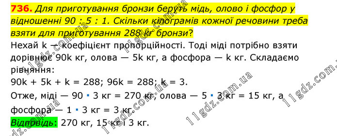 Для приготування бронзи беруть мідь, олово і фосфор у відношенні 90 : 5 : 1. Скільки кілограмів кожної речовини треба взяти для приготування 288 кг бронзи? Нехай k — коефіцієнт пропорційності. Тоді міді потрібно взяти дорівнює 90k кг, олова — 5k кг, а фосфора — k кг. Складаємо рівняння: 90k + 5k + k = 288; 96k = 288; k = 3. Отже, міді — 90 ∙ 3 кг = 270 кг, олова — 5 ∙ 3 кг = 15 кг, а фосфора — 1 ∙ 3 кг = 3 кг. Відповідь: 270 кг, 15 кг і 3 кг.