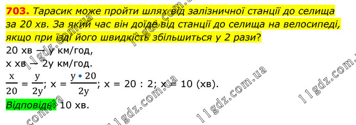 Тарасик може пройти шлях від залізничної станції до селища за 20 хв. За який час він доїде від станції до селища на велосипеді, якщо при їзді його швидкість збільшиться у 2 рази? 20 хв — у км/год, х хв — 2у км/год. х/20 = у/2у; х = (у • 20)/2у; х = 20 : 2; х = 10 (хв). Відповідь: 10 хв.