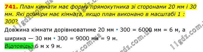 План кімнати має форму прямокутника зі сторонами 20 мм і 30 мм. Які розміри має кімната, якщо план виконано в масштабі 1 : 300? Довжина кімнати дорівнюватиме 20 мм ∙ 300 = 6000 мм = 6 м, а ширина — 30 мм ∙ 300 = 9000 мм = 9 м. Відповідь: 6 м х 9 м.