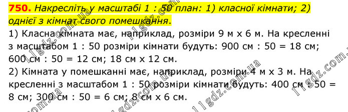 Накресліть у масштабі 1 : 50 план: 1) класної кімнати; 2) однієї з кімнат свого помешкання. 1) Класна кімната має, наприклад, розміри 9 м х 6 м. На кресленні з масштабом 1 : 50 розміри кімнати будуть: 900 см : 50 = 18 см; 600 см : 50 = 12 см; 18 см х 12 см. 2) Кімната у помешканні має, наприклад, розміри 4 м х 3 м. На кресленні з масштабом 1 : 50 розміри кімнати будуть: 400 см : 50 = 8 см; 300 см : 50 = 6 см; 8 см х 6 см.
