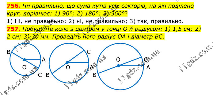 756. Чи правильно, що сума кутів усіх секторів, на які поділено круг, дорівнює: 1) 90°; 2) 180°; 3) 360°? 1) Ні, не правильно; 2) ні, не правильно; 3) так, правильно. 757. Побудуйте коло з центром у точці О й радіусом: 1) 1,5 см; 2) 2 см; 3) 30 мм. Проведіть його радіус OA і діаметр BC.