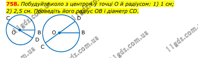 Побудуйте коло з центром у точці O й радіусом: 1) 1 см; 2) 2,5 см. Проведіть його радіус OB і діаметр CD.