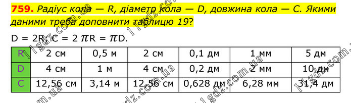 Радіус кола — R, діаметр кола — D, довжина кола — С. Якими даними треба доповнити таблицю 19? D = 2R; C = 2 πR = πD.