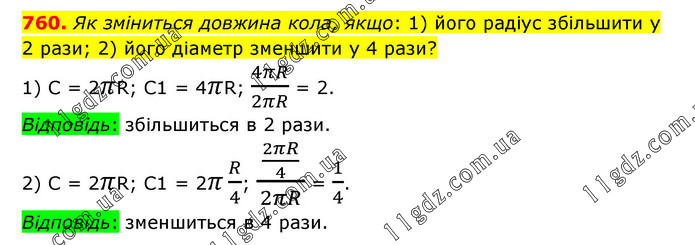 Як зміниться довжина кола, якщо: 1) його радіус збільшити у 2 рази; 2) його діаметр зменшити у 4 рази? 1) С = 2πR; C1 = 4πR; 4πR/2πR = 2. Відповідь: збільшиться в 2 рази. 2) C = 2πR; C1 = 2π R/4; (2πR/4)/2πR = 1/4. Відповідь: зменшиться в 4 рази.