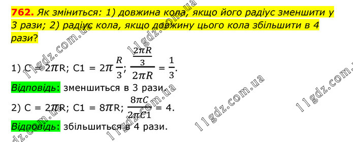 Як зміниться: 1) довжина кола, якщо його радіус зменшити у 3 рази; 2) радіус кола, якщо довжину цього кола збільшити в 4 рази? 1) C = 2πR; C1 = 2π R/3; (2πR/3)/2πR = 1/3. Відповідь: зменшиться в 3 рази. 2) С = 2πR; C1 = 8πR; 8πC/2πC1 = 4. Відповідь: збільшиться в 4 рази.