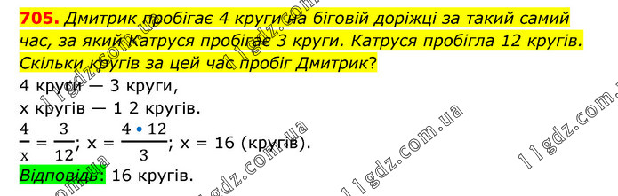 Дмитрик пробігає 4 круги на біговій доріжці за такий самий час, за який Катруся пробігає 3 круги. Катруся пробігла 12 кругів. Скільки кругів за цей час пробіг Дмитрик? 4 круги — 3 круги, х кругів — 1 2 кругів. 4/х = 3/12; х = (4 • 12)/3; х = 16 (кругів). Відповідь: 16 кругів.
