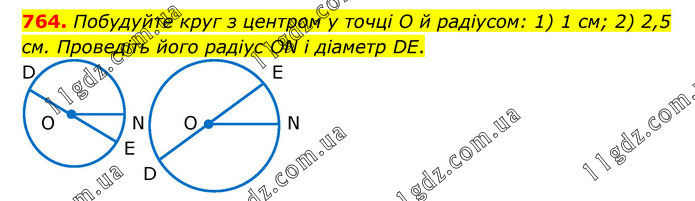 Побудуйте круг з центром у точці O й радіусом: 1) 1 см; 2) 2,5 см. Проведіть його радіус ON і діаметр DE.