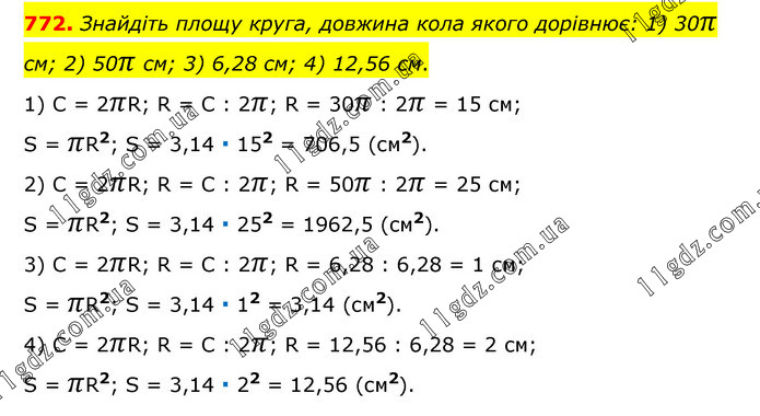 Знайдіть площу круга, довжина кола якого дорівнює: 1) 30π см; 2) 50π см; 3) 6,28 см; 4) 12,56 см. 1) С = 2πR; R = C : 2π; R = 30π : 2π = 15 см; S = πR2; S = 3,14 ∙ 152 = 706,5 (см2). 2) С = 2πR; R = C : 2π; R = 50π : 2π = 25 см; S = πR2; S = 3,14 ∙ 252 = 1962,5 (см2). 3) С = 2πR; R = C : 2π; R = 6,28 : 6,28 = 1 см; S = πR2; S = 3,14 ∙ 12 = 3,14 (см2). 4) С = 2πR; R = C : 2π; R = 12,56 : 6,28 = 2 см; S = πR2; S = 3,14 ∙ 22 = 12,56 (см2).