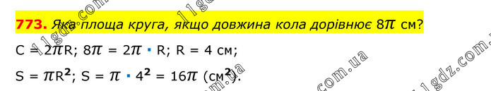 Яка площа круга, якщо довжина кола дорівнює 8π см? С = 2πR; 8π = 2π ∙ R; R = 4 см; S = πR2; S = π ∙ 42 = 16π (см2).