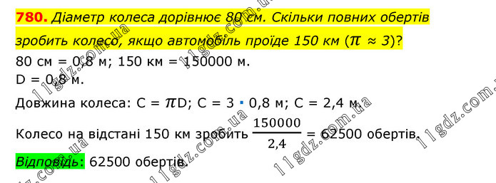 Діаметр колеса дорівнює 80 см. Скільки повних обертів зробить колесо, якщо автомобіль проїде 150 км (π ≈ 3)? 80 см = 0,8 м; 150 км = 150000 м. D = 0,8 м. Довжина колеса: C = πD; C = 3 ∙ 0,8 м; C = 2,4 м. Колесо на відстані 150 км зробить 150000/2,4 = 62500 обертів. Відповідь: 62500 обертів.
